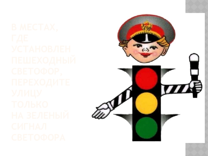 Слайд 7В местах, где установлен пешеходный светофор, переходите улицу только на зеленый сигнал