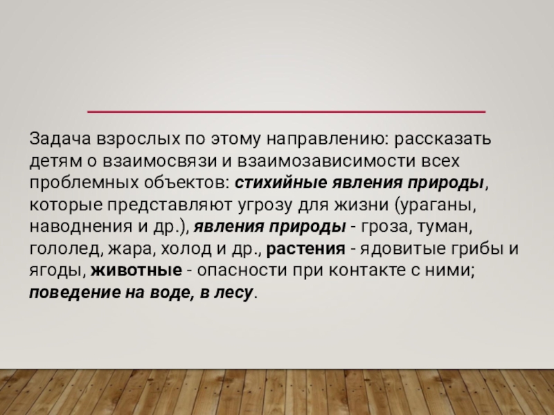 всех проблемных объектов: стихийные явления природы, которые представляют угрозу для жизни (ураганы, наводнения и др.), явления природы - гроза, туман, гололед, жара, холод и др., растения - ядовитые грибы и ягоды, животные - опасности при контакте с ними; поведение на воде, в лесу.
