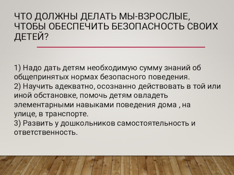 Слайд 3ЧТО ДОЛЖНЫ ДЕЛАТЬ МЫ-ВЗРОСЛЫЕ, ЧТОБЫ ОБЕСПЕЧИТЬ БЕЗОПАСНОСТЬ СВОИХ ДЕТЕЙ?