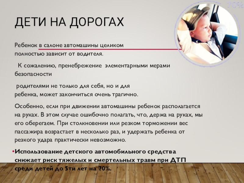 Использование детского автомобильного средства снижает риск тяжелых и смертельных травм при ДТП среди детей до 5ти лет на 70%.