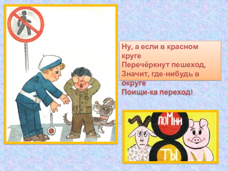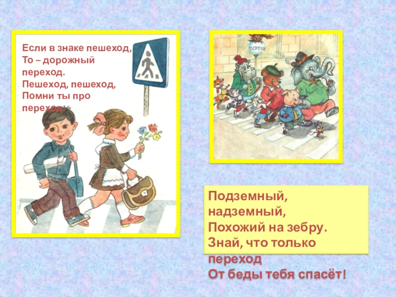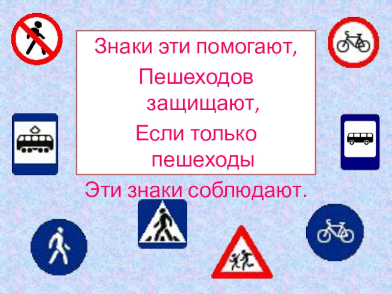 Знаки эти помогают,Пешеходов защищают,Если только пешеходыЭти знаки соблюдают.