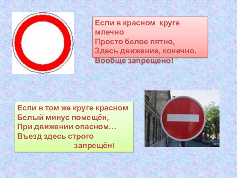 Если в красном круге млечноПросто белое пятно,Здесь движение, конечно.Вообще запрещено!Если в том же круге красномБелый минус помещён,При