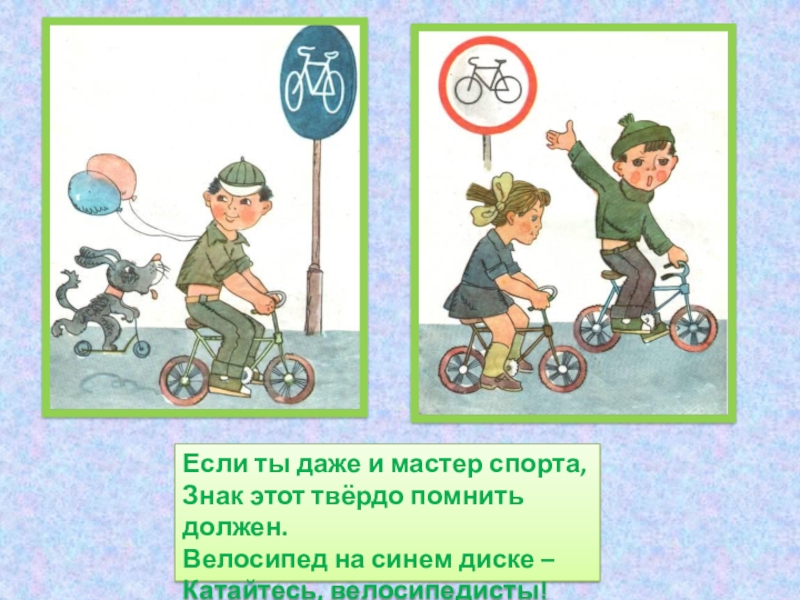 Если ты даже и мастер спорта,Знак этот твёрдо помнить должен.Велосипед на синем диске –Катайтесь, велосипедисты!