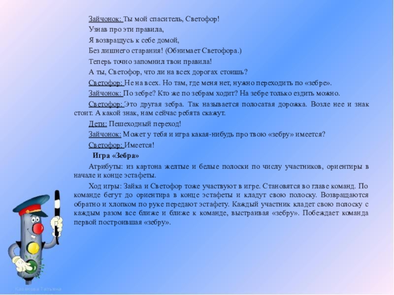Ход игры: Зайка и Светофор тоже участвуют в игре. Становятся во главе команд. По команде бегут до ориентира в конце эстафеты и кладут свою полоску. Возвращаются обратно и хлопком по руке передают эстафету. Каждый участник кладет свою полоску с каждым разом все ближе и ближе к команде, выстраивая «зебру». Побеждает команда первой построившая «зебру».