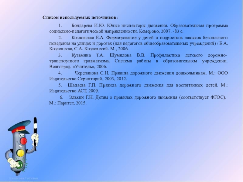 2. Козловская Е.А. Формирование у детей и подростков навыков безопасного поведения на улицах и дорогах (для педагогов общеобразовательных учреждений) / Е.А. Козловская, С.А. Козловский. М., 2006.
