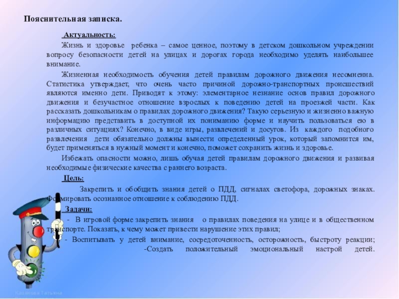 Жизненная необходимость обучения детей правилам дорожного движения несомненна. Статистика утверждает, что очень часто причиной дорожно-транспортных происшествий являются именно дети. Приводят к этому: элементарное незнание основ правил дорожного движения и безучастное отношение взрослых к поведению детей на проезжей части. Как рассказать дошкольникам о правилах дорожного движения? Такую серьезную и жизненно важную информацию представить в доступной их пониманию форме и научить пользоваться ею в различных ситуациях? Конечно, в виде игры, развлечений и досугов. Из каждого подобного развлечения дети обязательно должны вынести определенный урок, который запомнится им, будет применяться в нужный момент и конечно, поможет сохранить жизнь и здоровье.