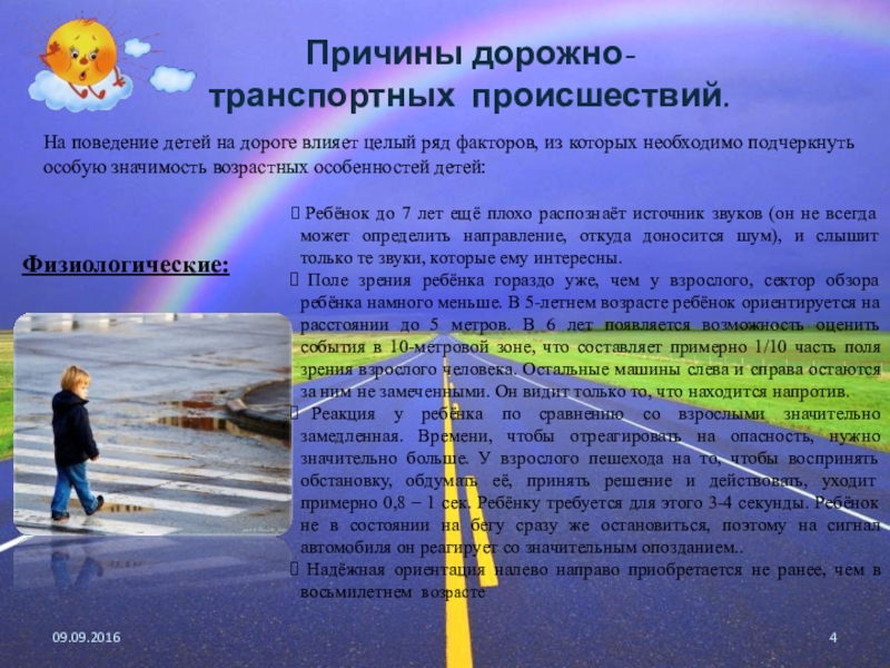 Реакция у ребёнка по сравнению со взрослыми значительно замедленная. Времени, чтобы отреагировать на опасность, нужно значительно больше. У взрослого пешехода на то, чтобы воспринять обстановку, обдумать её, принять решение и действовать, уходит примерно 0,8 – 1 сек. Ребёнку требуется для этого 3-4 секунды. Ребёнок не в состоянии на бегу сразу же остановиться, поэтому на сигнал автомобиля он реагирует со значительным опозданием..