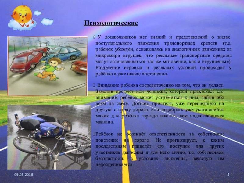 Ребёнок не осознаёт ответственности за собственное поведение на дороге. Не прогнозирует, к каким последствиям приведёт его поступок для других участников движения и для него лично, т.е. собственная безопасность в условиях движения, зачастую им недооценивается