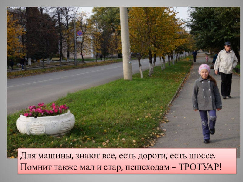 Для машины, знают все, есть дороги, есть шоссе.Помнит также мал и стар, пешеходам – ТРОТУАР!