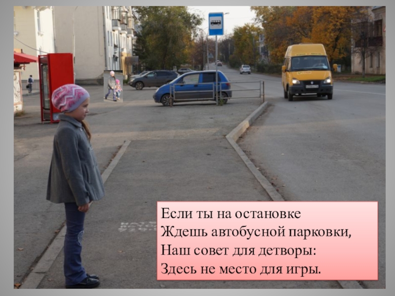 Если ты на остановкеЖдешь автобусной парковки,Наш совет для детворы:Здесь не место для игры.