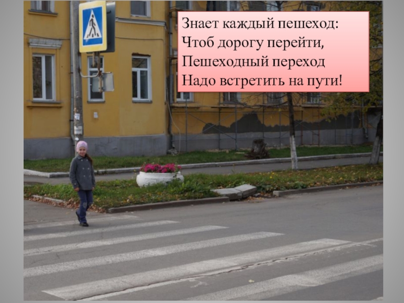 Знает каждый пешеход:Чтоб дорогу перейти, Пешеходный переходНадо встретить на пути!