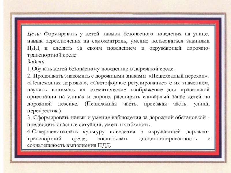 Слайд 21Цель: Формировать у детей навыки безопасного поведения на улице, навык переключения