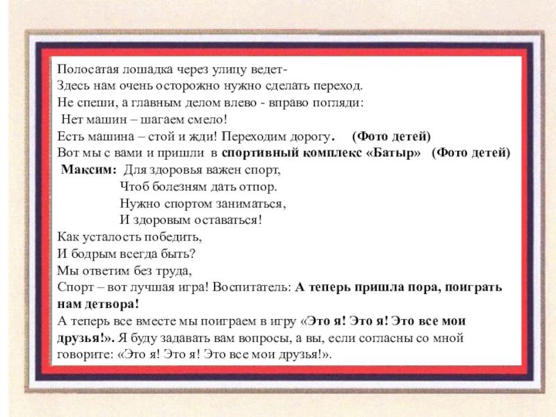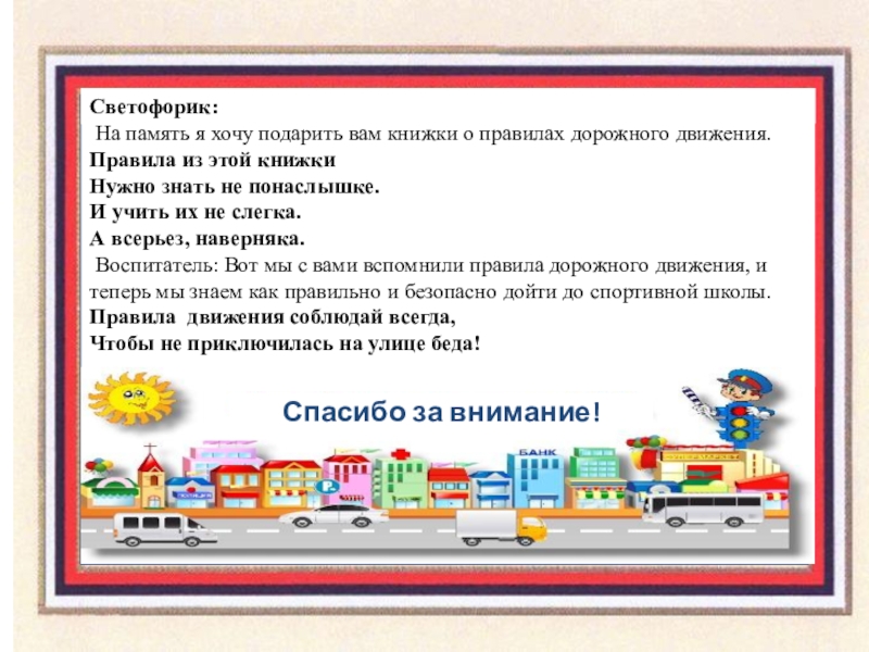 Воспитатель: Вот мы с вами вспомнили правила дорожного движения, и теперь мы знаем как правильно и безопасно дойти до спортивной школы.