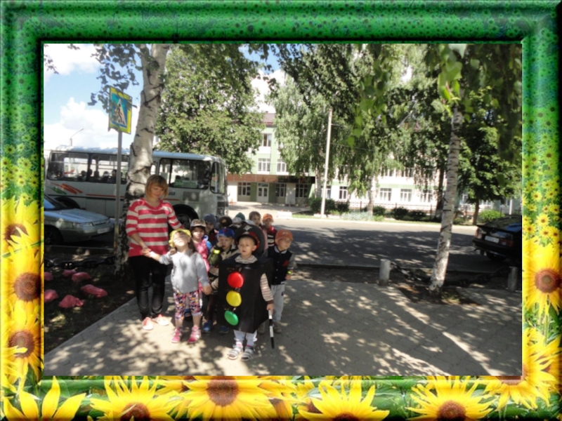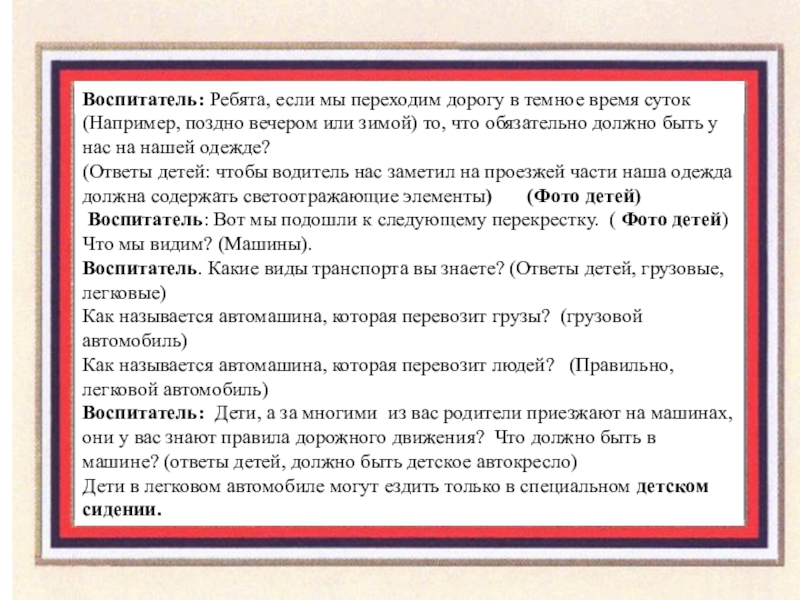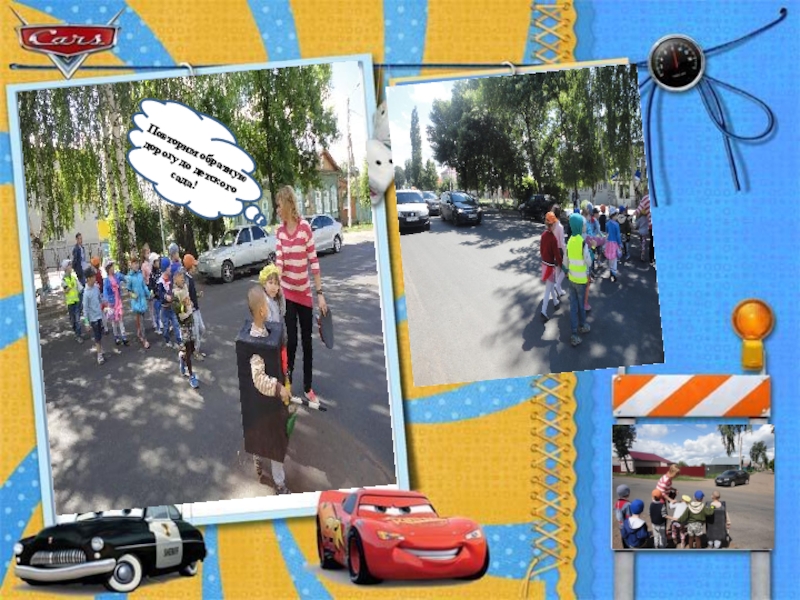 Воспитатель: Вот мы подошли к следующему перекрестку. ( Фото детей) Что мы видим? (Машины).