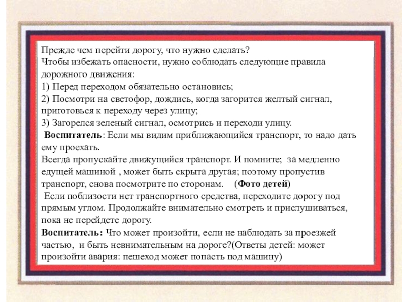 Воспитатель: Что может произойти, если не наблюдать за проезжей частью, и быть невнимательным на дороге?(Ответы детей: может произойти авария: пешеход может попасть под машину)