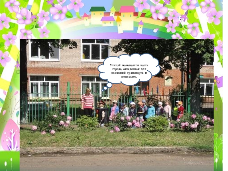 А сейчас построились парами друг за другом. Мы с вами выходим с территории детского сада. И что мы видим? Правильно, улицу. Улицей называется часть города, отведенная для движения транспорта и пешеходов. На ней есть проезжая и пешеходная часть. Как вы думаете, что такое проезжая часть? (Ответы детей)