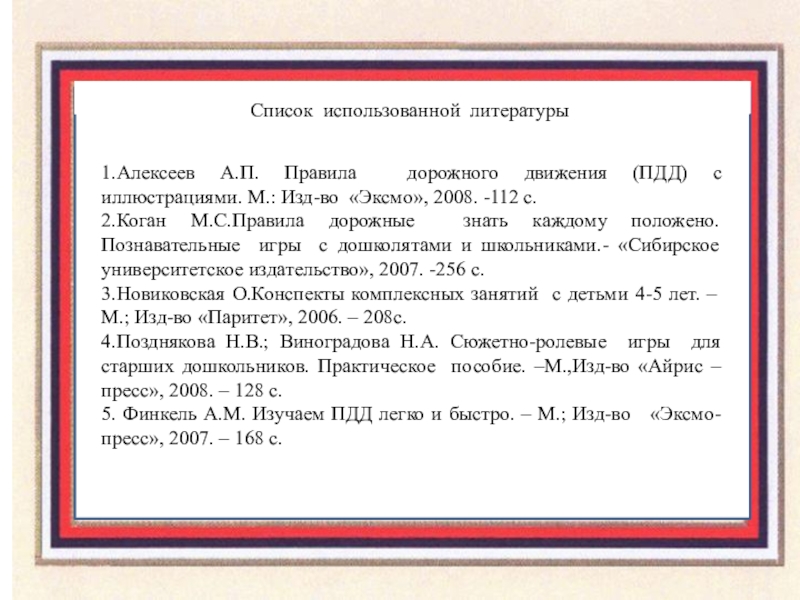 5. Финкель А.М. Изучаем ПДД легко и быстро. – М.; Изд-во «Эксмо-пресс», 2007. – 168 с.