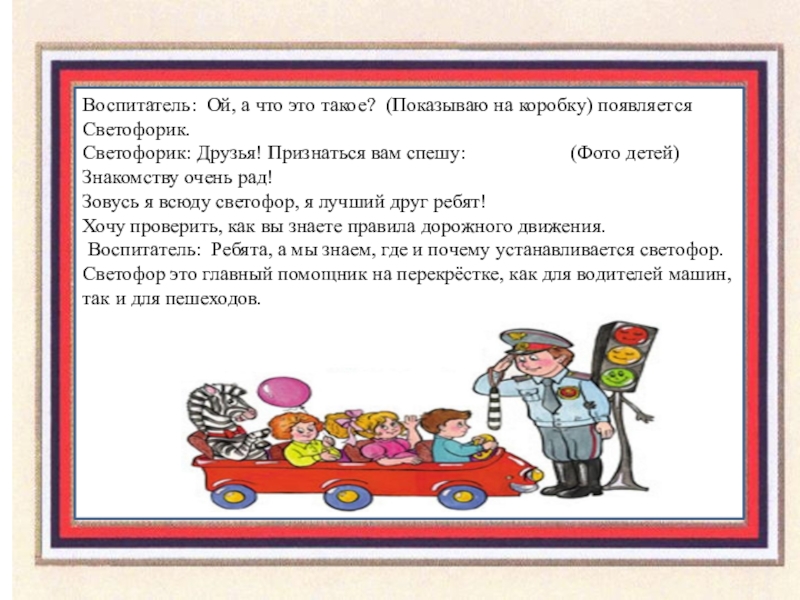 Слайд 22Воспитатель: Ой, а что это такое? (Показываю на коробку) появляется Светофорик.