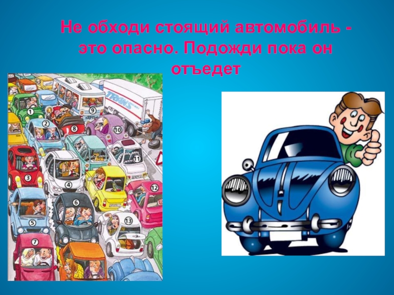 Слайд 13Не обходи стоящий автомобиль - это опасно. Подожди пока он отъедет