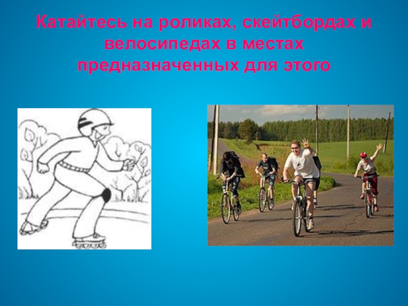 Слайд 19Катайтесь на роликах, скейтбордах и велосипедах в местах предназначенных для этого