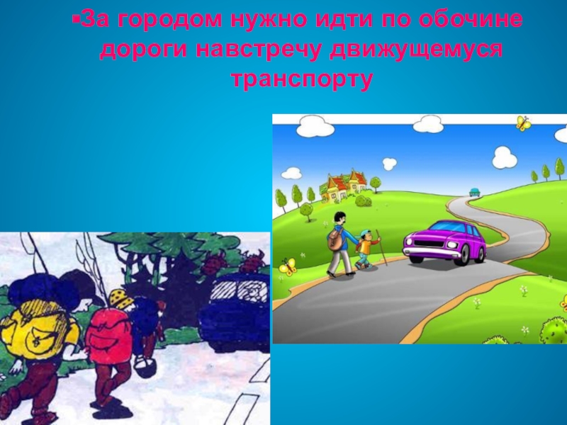 Слайд 21За городом нужно идти по обочине дороги навстречу движущемуся транспорту