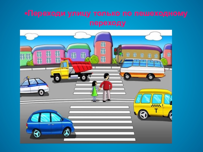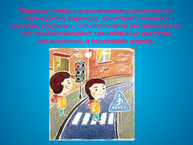 Слайд 5Переходя улицу с двусторонним движением по пешеходному переходу, посмотрите налево и