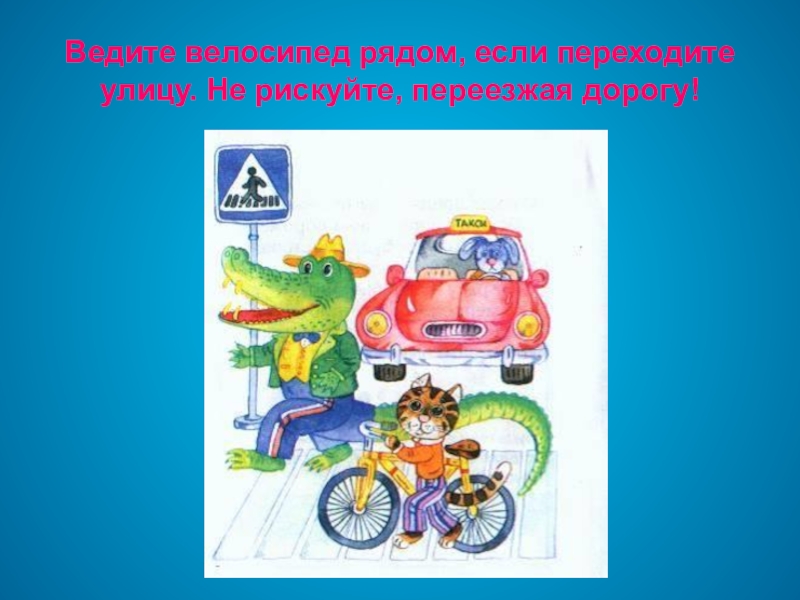 Слайд 18Ведите велосипед рядом, если переходите улицу. Не рискуйте, переезжая дорогу!