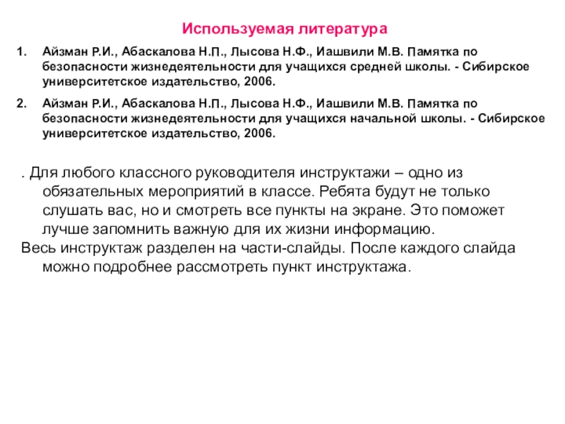 Используемая литератураАйзман Р.И., Абаскалова Н.П., Лысова Н.Ф., Иашвили М.В. Памятка по безопасности жизнедеятельности для учащихся средней школы.