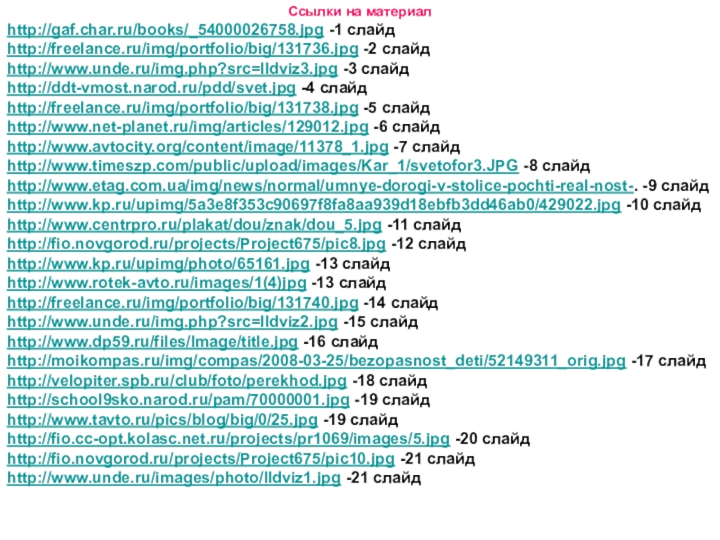 Ссылки на материалhttp://gaf.char.ru/books/_54000026758.jpg -1 слайдhttp://freelance.ru/img/portfolio/big/131736.jpg -2 слайдhttp://www.unde.ru/img.php?src=Ildviz3.jpg -3 слайдhttp://ddt-vmost.narod.ru/pdd/svet.jpg -4 слайдhttp://freelance.ru/img/portfolio/big/131738.jpg -5 слайдhttp://www.net-planet.ru/img/articles/129012.jpg -6 слайдhttp://www.avtocity.org/content/image/11378_1.jpg -7 слайдhttp://www.timeszp.com/public/upload/images/Kar_1/svetofor3.JPG