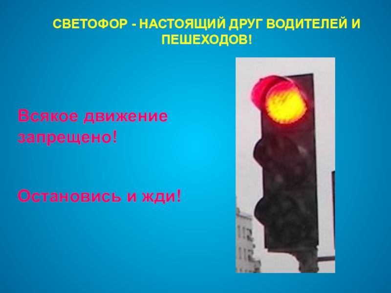 СВЕТОФОР - НАСТОЯЩИЙ ДРУГ ВОДИТЕЛЕЙ И ПЕШЕХОДОВ! Всякое движение запрещено! Остановись и жди!