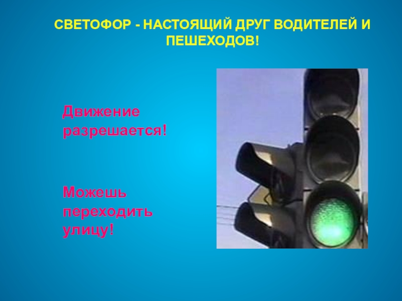 СВЕТОФОР - НАСТОЯЩИЙ ДРУГ ВОДИТЕЛЕЙ И ПЕШЕХОДОВ! Движение разрешается!  Можешь переходить улицу!