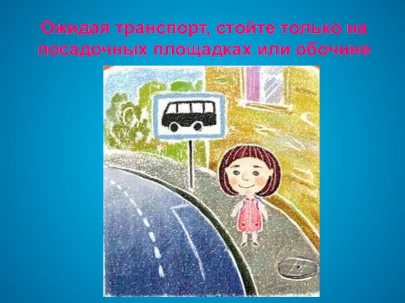 Слайд 14Ожидая транспорт, стойте только на посадочных площадках или обочине