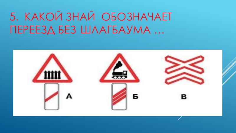 5. Какой знай обозначает переезд без 	шлагбаума …