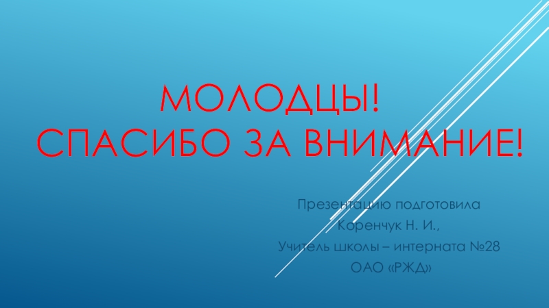 Молодцы! Спасибо за внимание!Презентацию подготовила Коренчук Н. И.,Учитель школы – интерната №28 ОАО «РЖД»