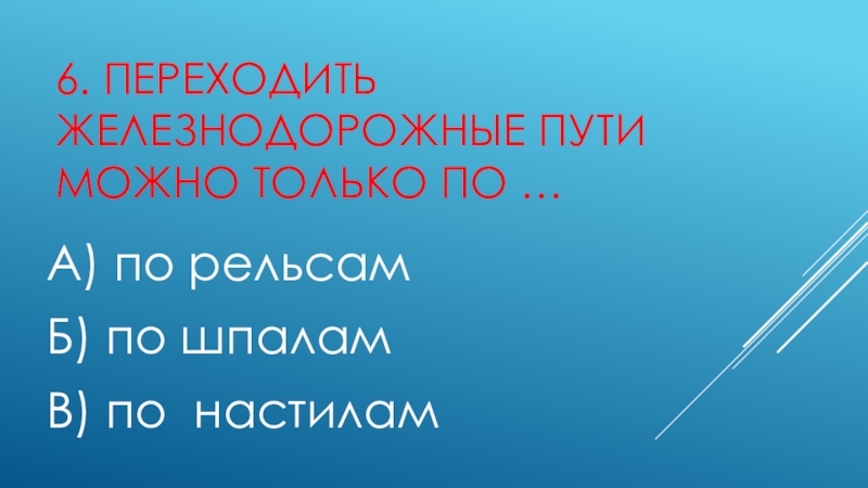 6. Переходить железнодорожные пути можно только по …А) по рельсамБ) по шпаламВ) по настилам