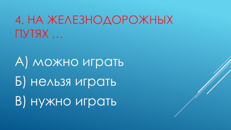 4. На железнодорожных 	путях …А) можно игратьБ) нельзя игратьВ) нужно играть