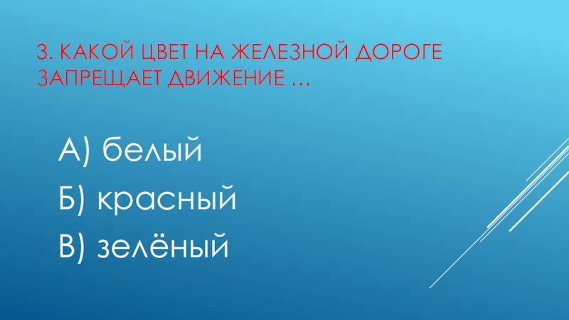 3. Какой цвет на железной дороге 	запрещает движение …А) белыйБ) красный В) зелёный