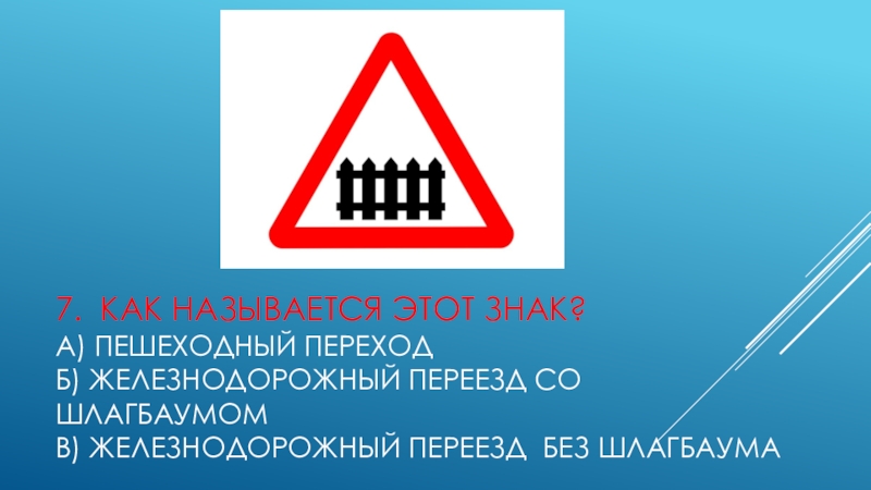 7. Как называется этот знак? а) Пешеходный переход б) железнодорожный переезд со  	шлагбаумом В) железнодорожный переезд