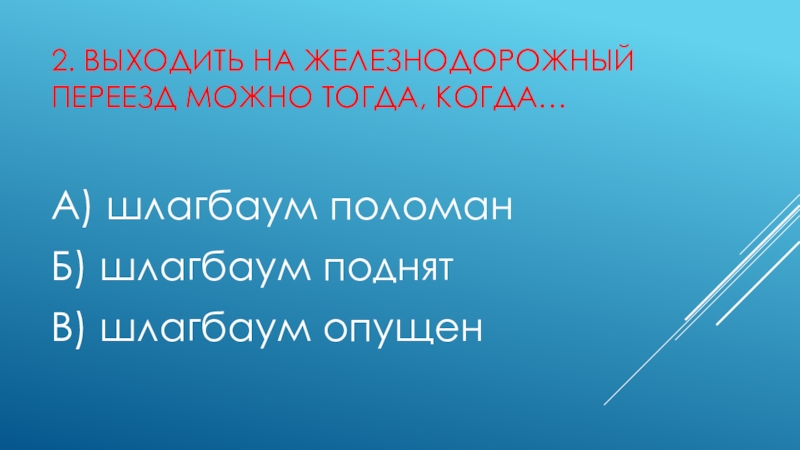 2. Выходить на железнодорожный 	переезд можно тогда, когда…А) шлагбаум поломанБ) шлагбаум поднятВ) шлагбаум опущен