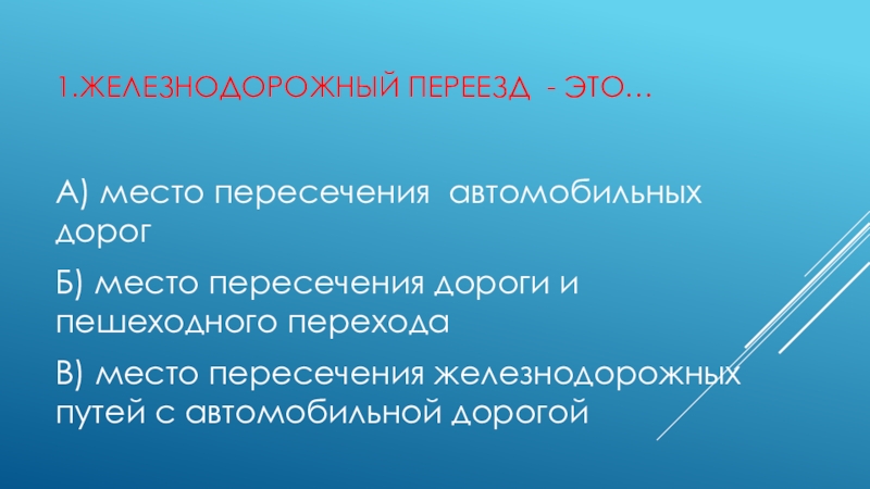 1.Железнодорожный переезд - это…А) место пересечения автомобильных дорогБ) место пересечения дороги и пешеходного переходаВ) место пересечения железнодорожных