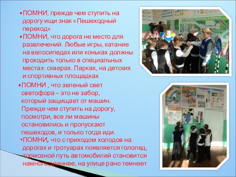 ПОМНИ, что с приходом холодов на дорогах и тротуарах появляется гололед, тормозной путь автомобилей становится намного длиннее, на улице рано темнеет