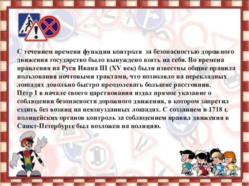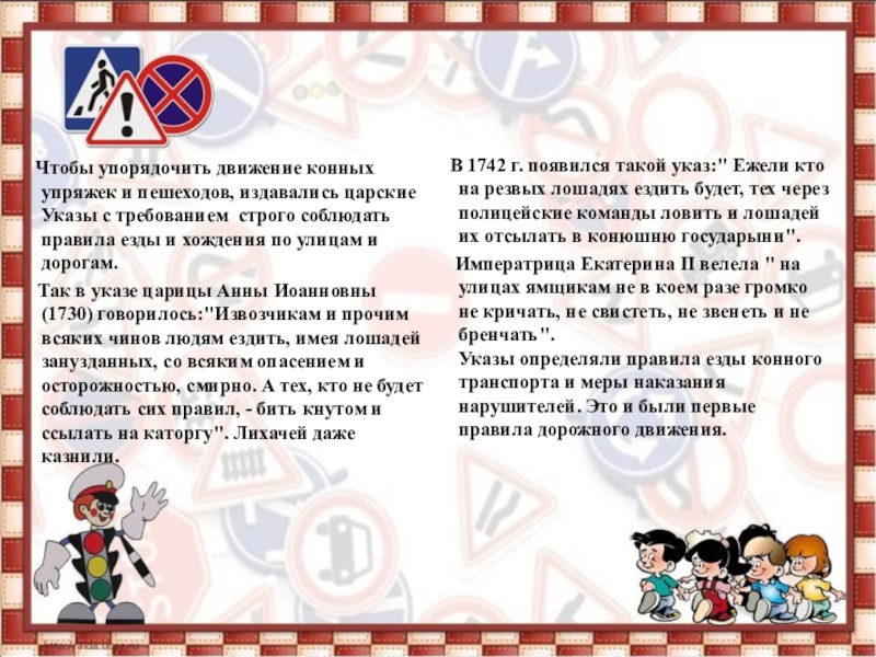 Указы определяли правила езды конного транспорта и меры наказания нарушителей. Это и были первые правила дорожного движения.