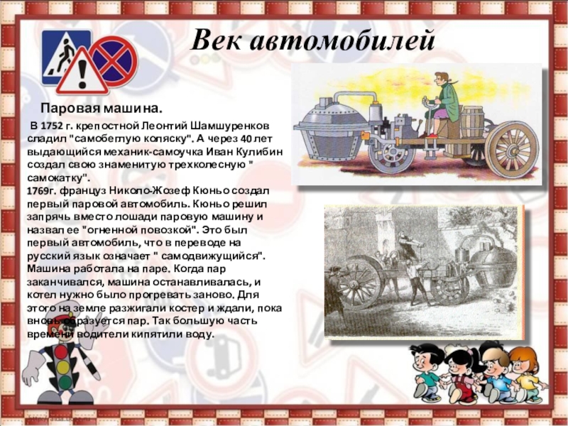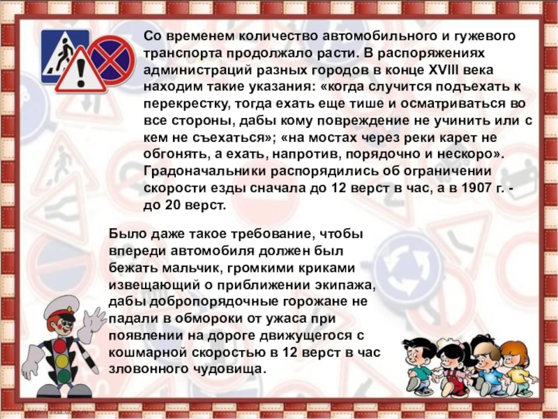 Со временем количество автомобильного и гужевого транспорта продолжало расти. В распоряжениях администраций разных городов в конце XVIII века находим такие указания: «когда случится подъехать к перекрестку, тогда ехать еще тише и осматриваться во все стороны, дабы кому повреждение не учинить или с кем не съехаться»; «на мостах через реки карет не обгонять, а ехать, напротив, порядочно и нескоро». Градоначальники распорядились об ограничении скорости езды сначала до 12 верст в час, а в 1907 г. - до 20 верст.