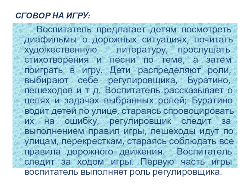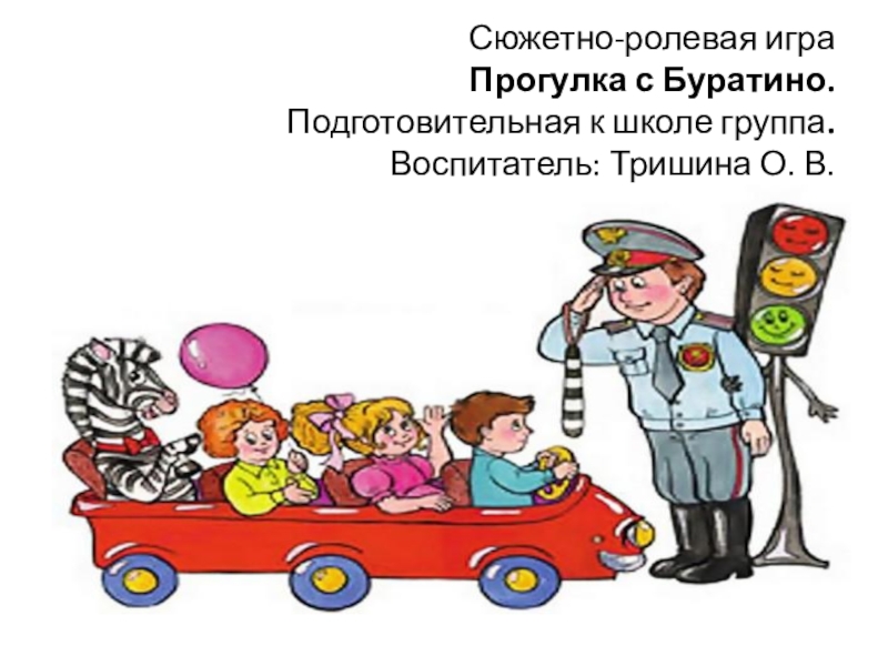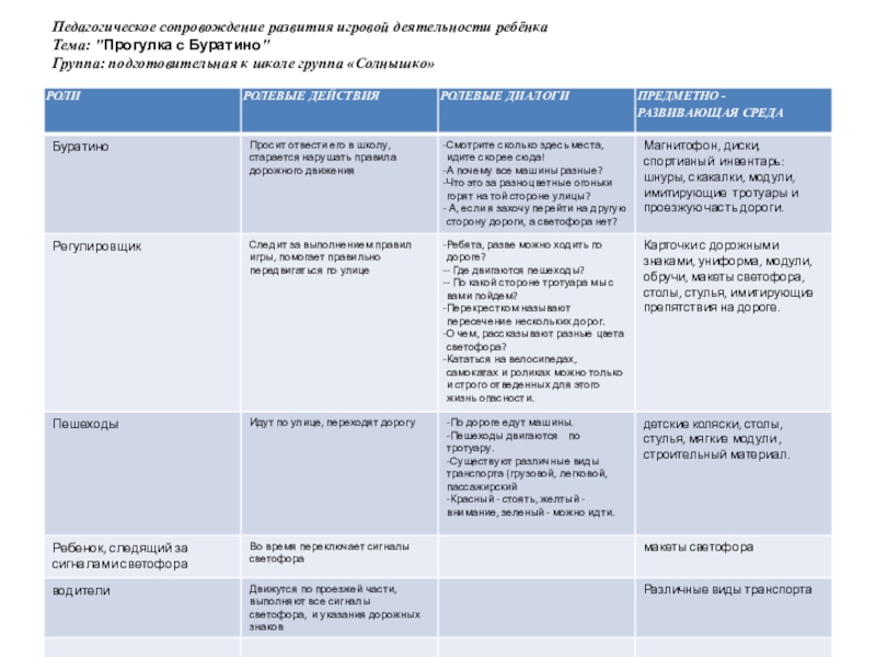 дорожных ситуациях, почитать художественную литературу, прослушать стихотворения и песни по теме, а затем поиграть в игру. Дети распределяют роли, выбирают себе регулировщика, Буратино, пешеходов и т д. Воспитатель рассказывает о целях и задачах выбранных ролей; Буратино водит детей по улице, стараясь спровоцировать их на ошибку, регулировщик следит за выполнением правил игры, пешеходы идут по улицам, перекресткам, стараясь соблюдать все правила дорожного движения. Воспитатель следит за ходом игры. Первую часть игры воспитатель выполняет роль регулировщика.