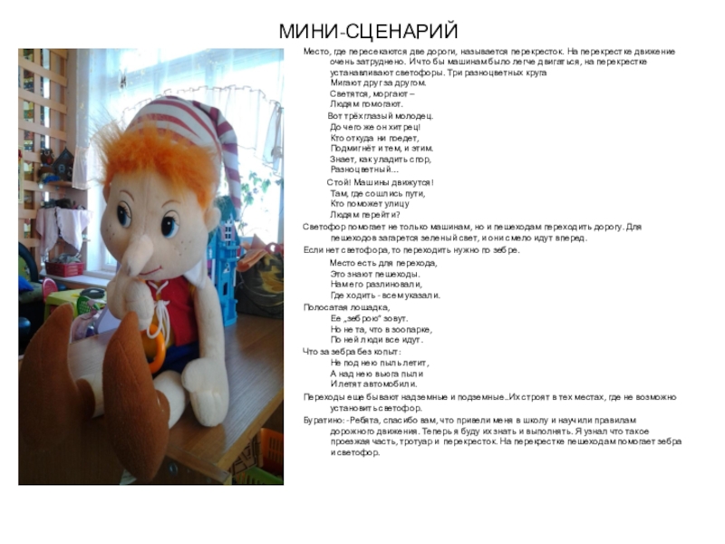 Буратино: -Ребята, спасибо вам, что привели меня в школу и научили правилам дорожного движения. Теперь я буду их знать и выполнять. Я узнал что такое проезжая часть, тротуар и перекресток. На перекрестке пешеходам помогает зебра и светофор.