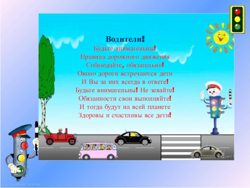 Слайд 20 Водители! Будьте внимательны! Правила дорожного движения Соблюдайте, обязательно! Около дороги встречаются дети И Вы за них