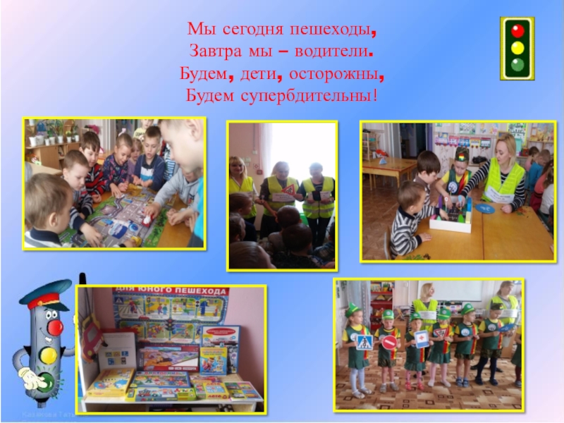 Мы сегодня пешеходы, Завтра мы – водители. Будем, дети, осторожны, Будем супербдительны!