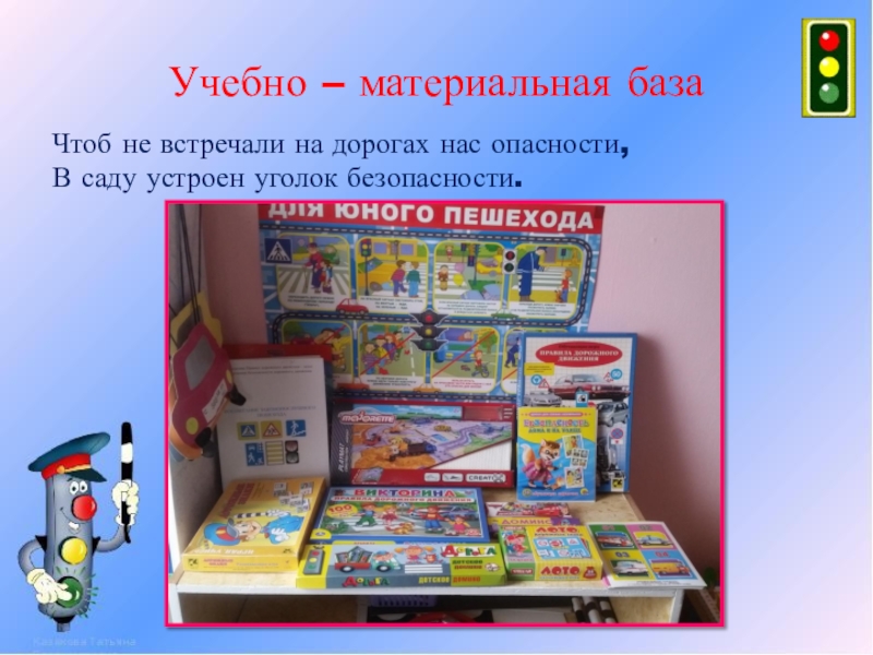 Учебно – материальная база Чтоб не встречали на дорогах нас опасности, В саду устроен уголок безопасности.