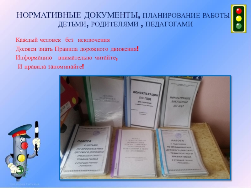 НОРМАТИВНЫЕ ДОКУМЕНТЫ, ПЛАНИРОВАНИЕ РАБОТЫ С ДЕТЬМИ, РОДИТЕЛЯМИ , ПЕДАГОГАМИКаждый человек без исключенияДолжен знать Правила дорожного движения!Информацию