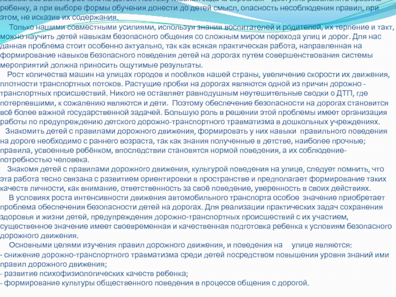 Рост количества машин на улицах городов и посёлков нашей страны, увеличение скорости их движения, плотности транспортных потоков. Растущие пробки на дорогах являются одной из причин дорожно - транспортных происшествий. Никого не оставляет равнодушным неутешительные сводки о ДТП, где потерпевшими, к сожалению являются и дети. Поэтому обеспечение безопасности на дорогах становится всё более важной государственной задачей. Большую роль в решении этой проблемы имеет организация работы по предупреждению детского дорожно-транспортного травматизма в дошкольных учреждениях.